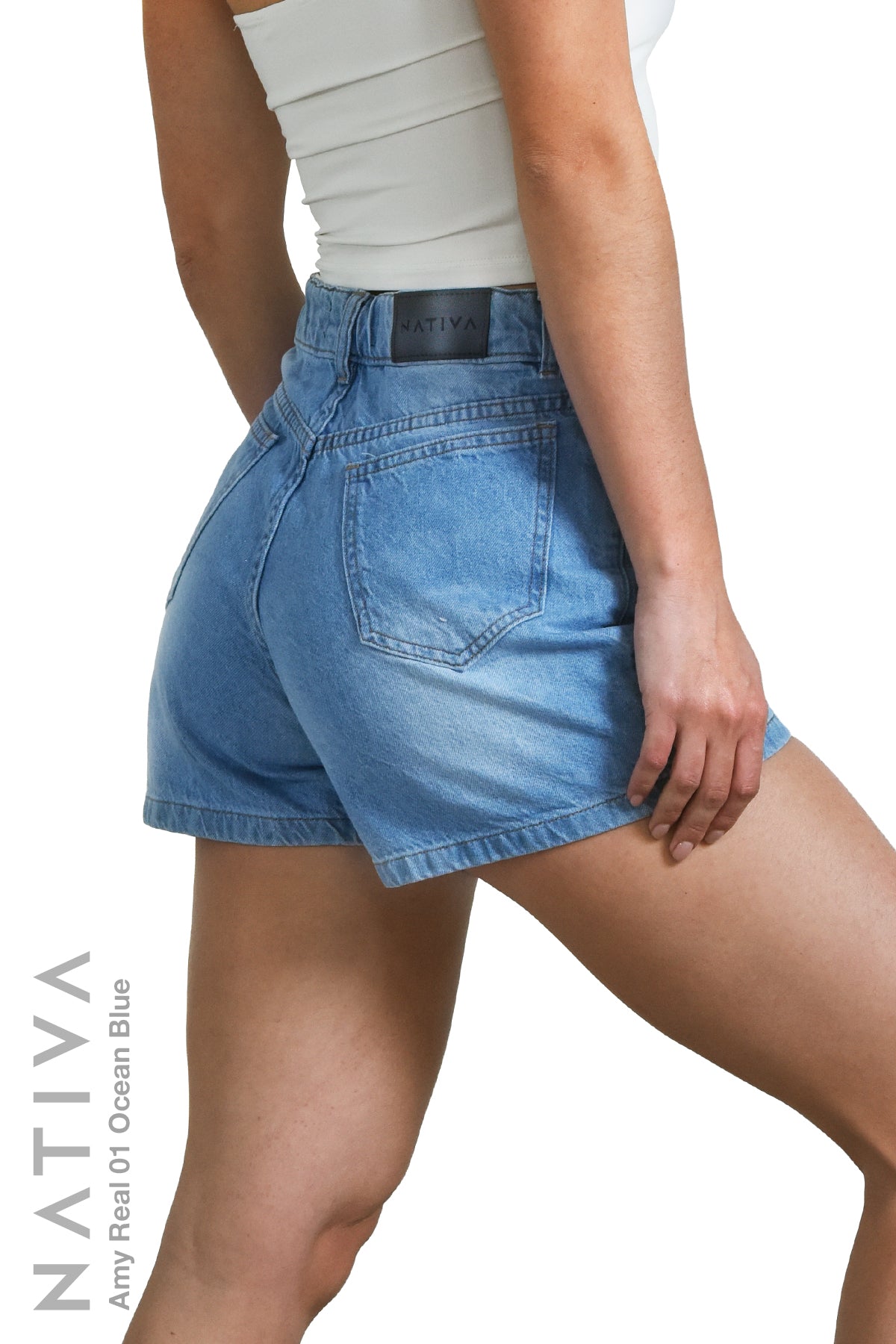 MOM SHORTS, TRUE DENIM, AMY REAL 00 OCEAN BLUE. Talle Alto. Auténtico e Interminable. Cintura Ajustable PERFECT FIT®